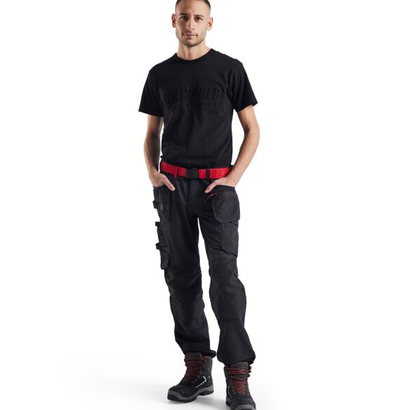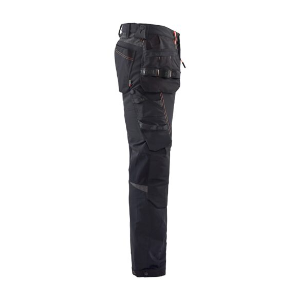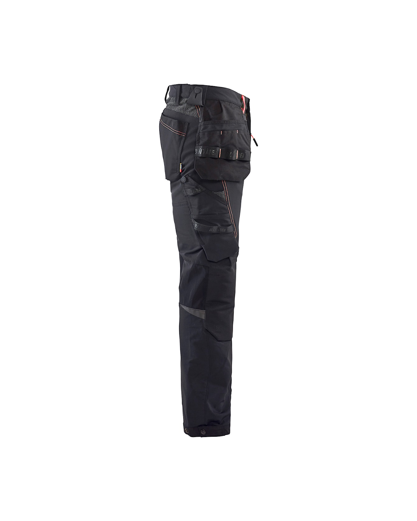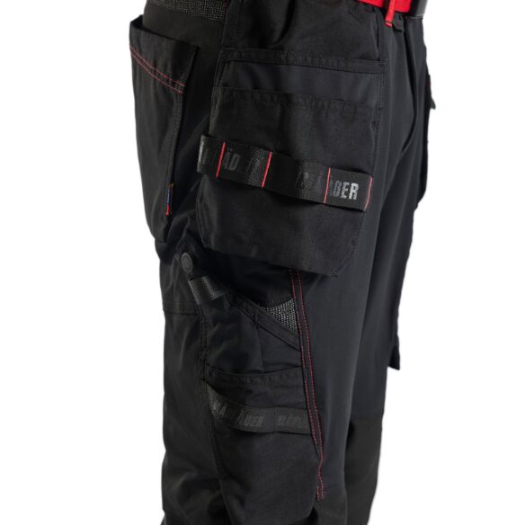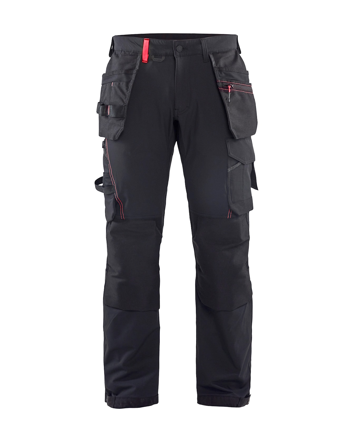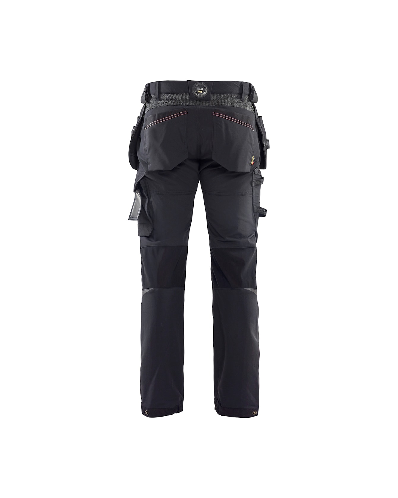 Riipputaskuhousut hieman ohuemmalla neljään suuntaan joustavalla materiaalilla, joka luo maksimaalista mukavuutta. Housuilla on kapeampi istuvuus. CORDURA®-stretch vahvistetut, alhaalta avattavat polvisuojataskut, riipputaskut, joista toinen vetoketjulla, palkeelliset takataskut, joista toinen vetoketjulla, mittatasku ja työkalulenkit sekä oikealla että vasemmalla puolella. Verkkokangasta on lisätty polvitaipeisiin hengittävyyden ja viileyden lisäämiseksi lämpimissä ja rankoissa työolosuhteissa.