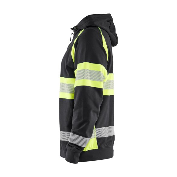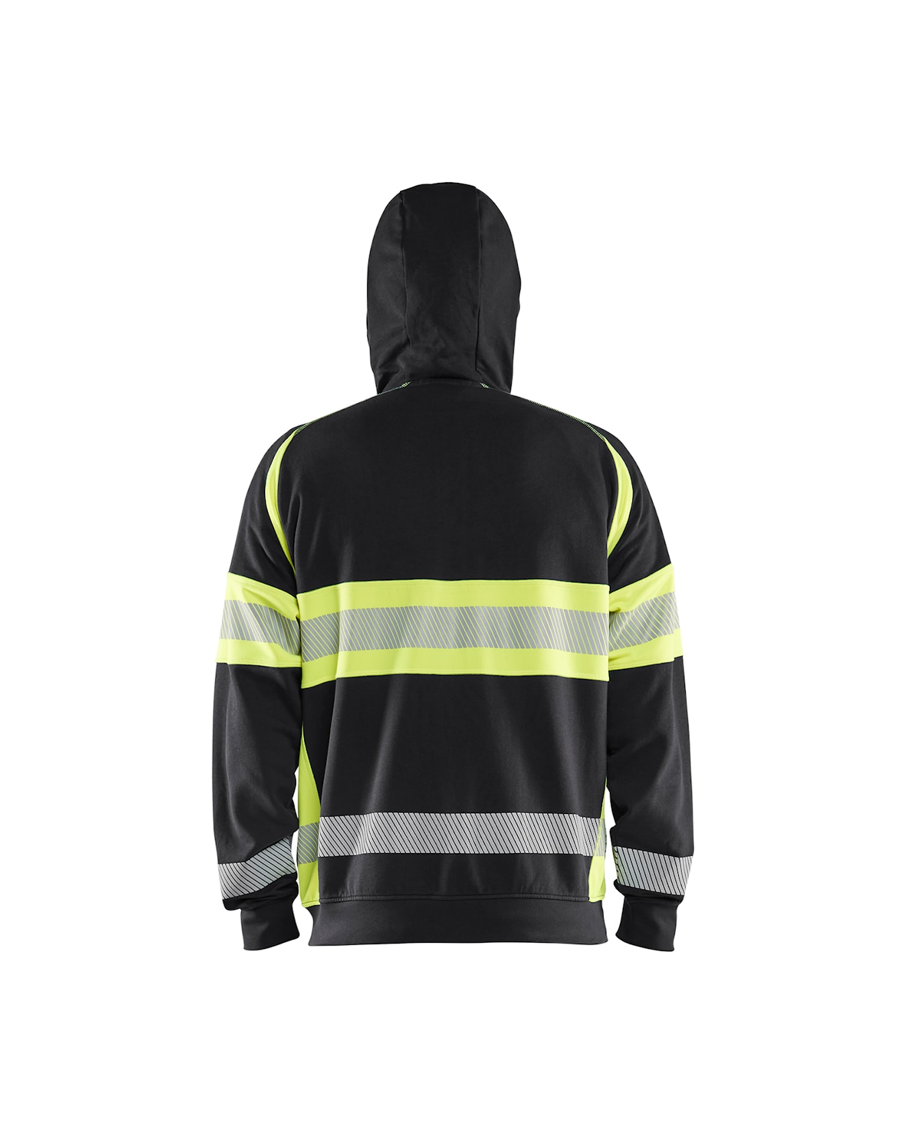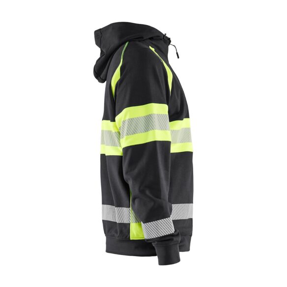 Pehmeä ja mukava puuvillainen highvis huppari, jossa on katkonaiset heijaistimet joustavuuden ja hengittävyyden lisäämiseksi. Taskut sivuilla, korkea kaulus, pitkä vetoketju edessä sekä resorit helmassa ja hihoissa. Tummat alueet on 100% puuvilla ja heijastavat alueet 100% polyesteriä. Sertifioitu EN ISO 20471, luokka 1.