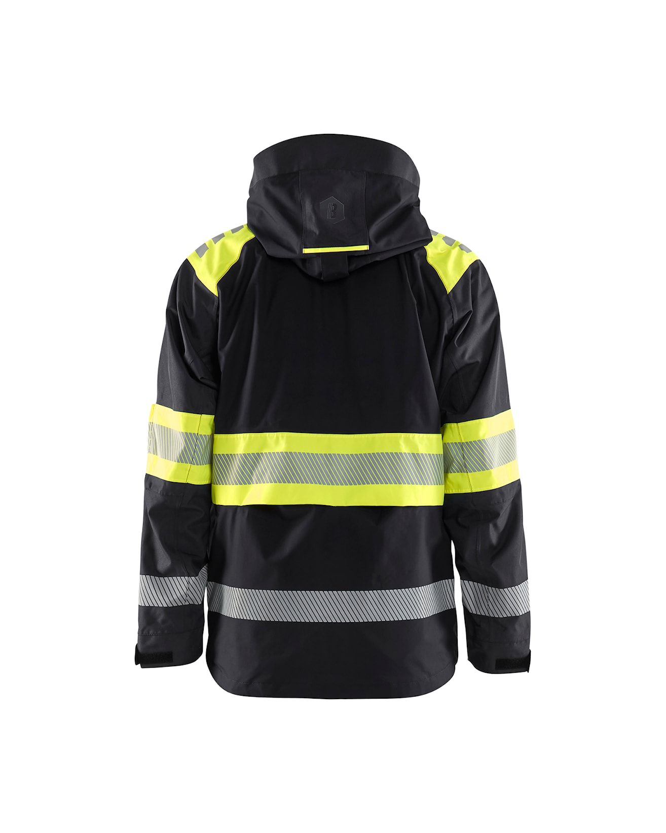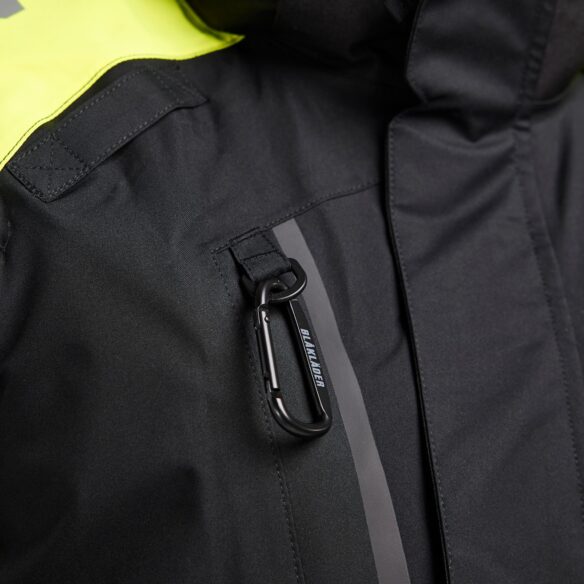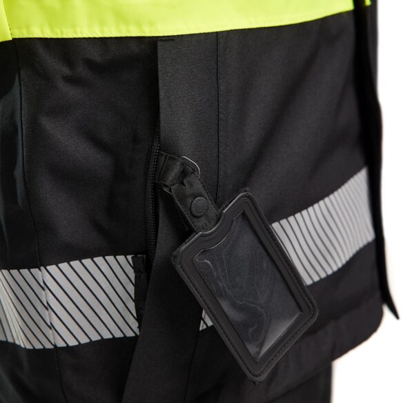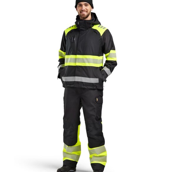 Highvis kuoritakki, luokka 1, mukavalla ja tilavalla istuvuudella. Takki on tuulen- ja vedenpitävä teipatuilla saumoilla. Irrotettava huppu soveltuu käytettäväksi kypärän ja kuulosuojaimien kanssa. Harjattu verkkovuori lisää mukavuutta ja lämpötilan säätöä.