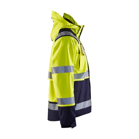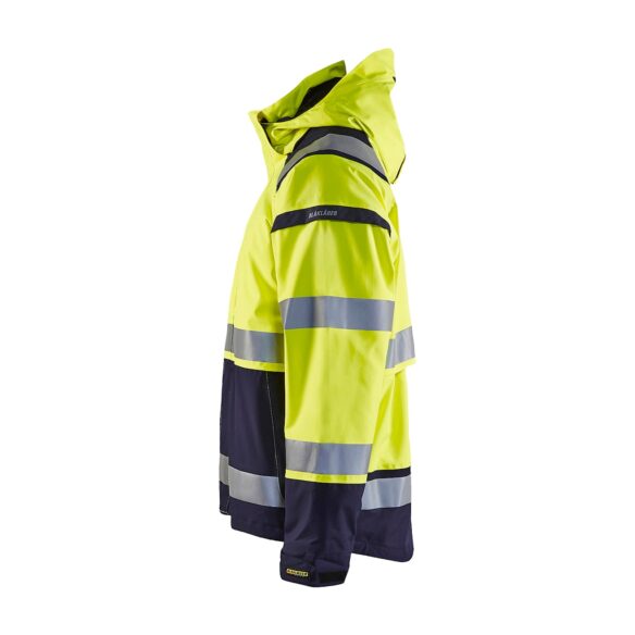 - Tuulen- ja vedenpitävä, hengittävä ja joustava materiaali. 11 000 mm/4000 g/m²/24 h. Fluoresoivat värit ovat EN ISO 20471 -standardin mukaisia (Näkyvä varoitusvaatetus ammattikäyttöön). Materiaali on EN 343 -standardin luokan 3/3 -mukainen (Suojaus sateelta).