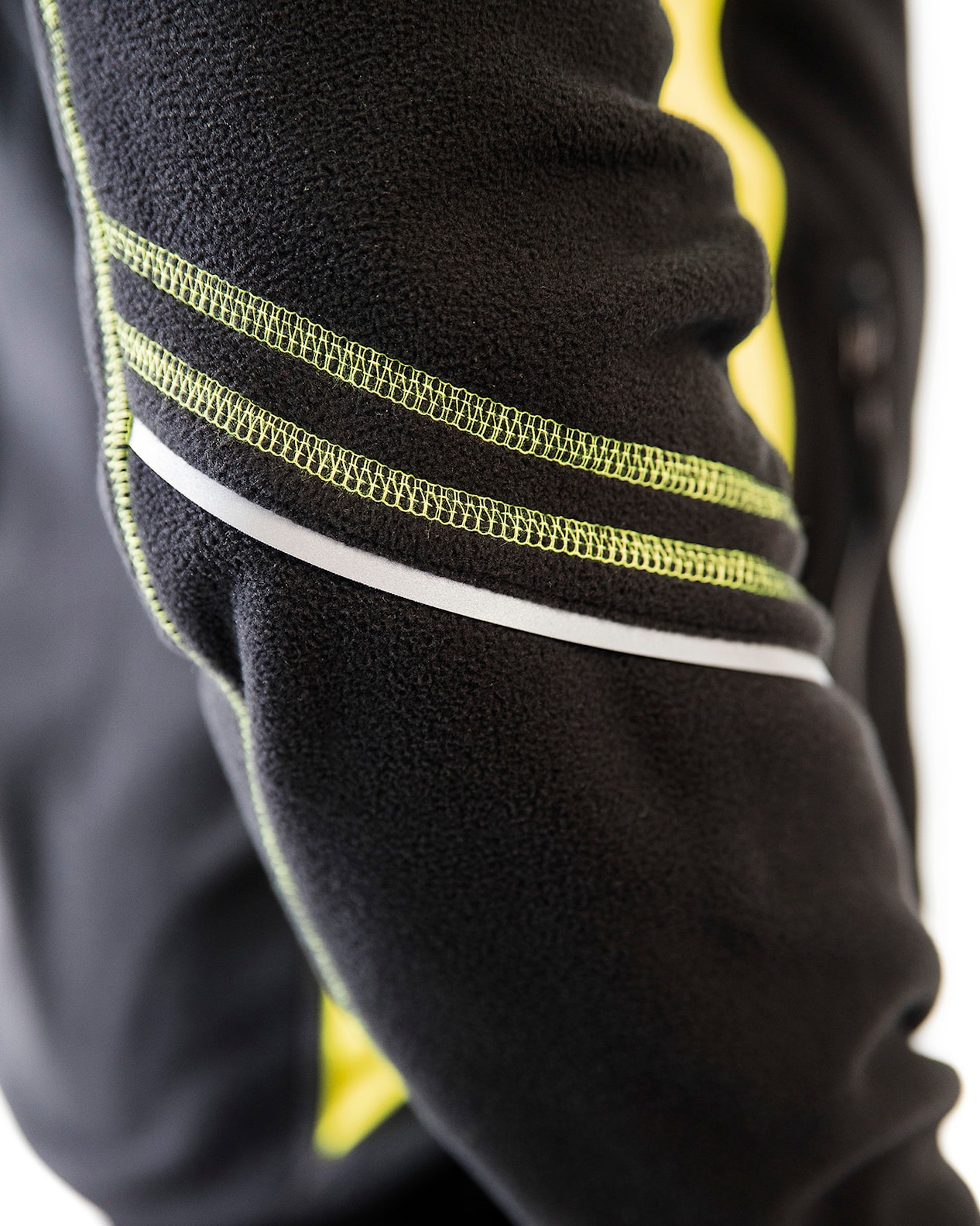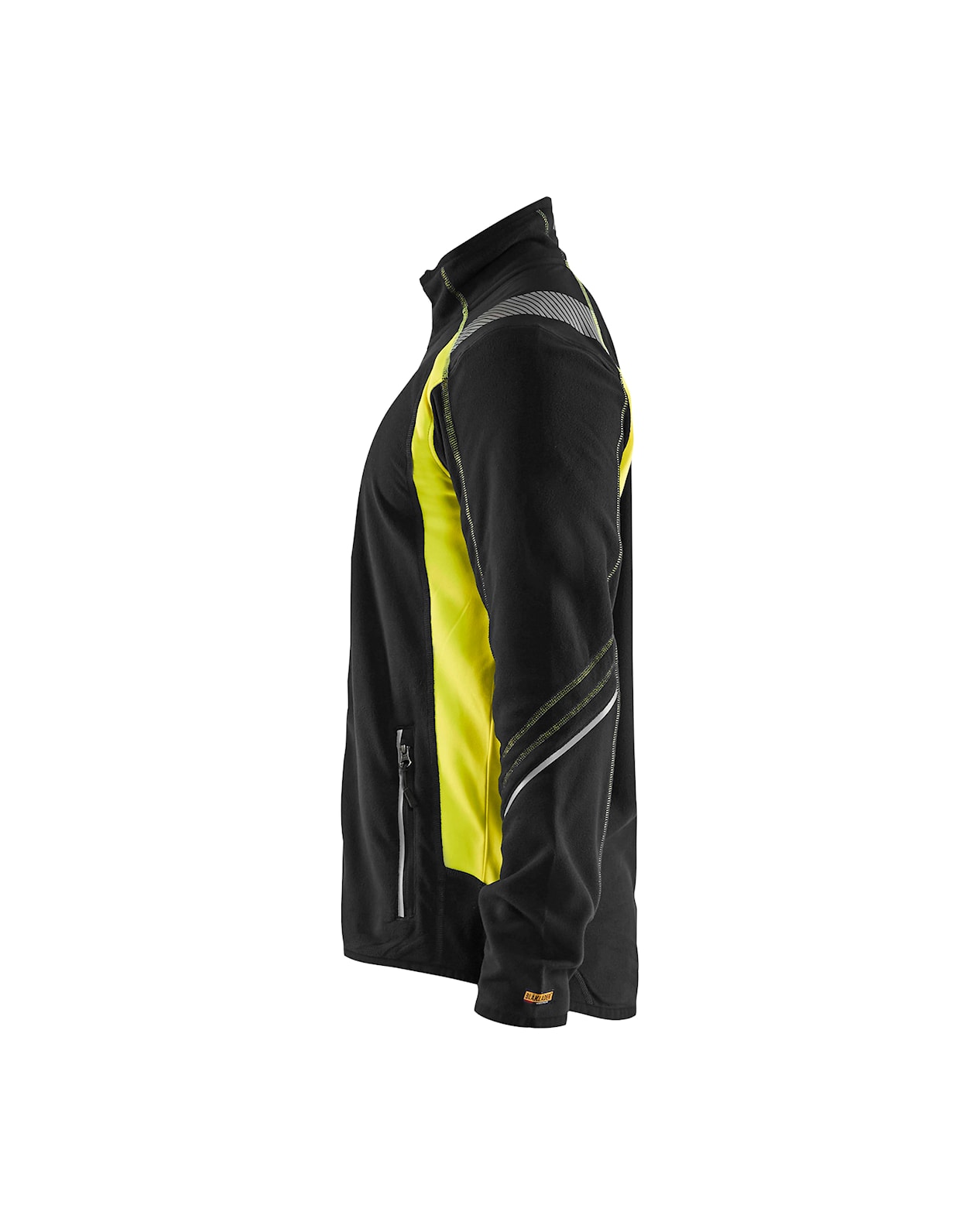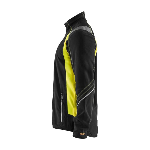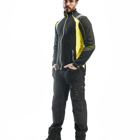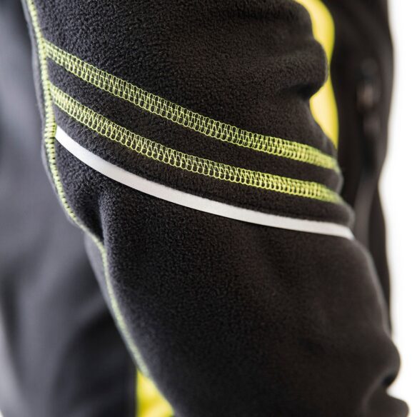 Nukkaantumista vastaan käsitelty microfleece, huomiovärisillä yksityiskohdilla parempaa näkyvyyttä varten. Fleecessä on heijastavia yksityiskohtia hihoissa, taskuissa ja hartioilla. Etutaskut vetoketjuilla ja kaksi taskua sisäpuolella. Selkäosa on pidennetty ja hihansuissa sekä helmassa on joustava reunus.
