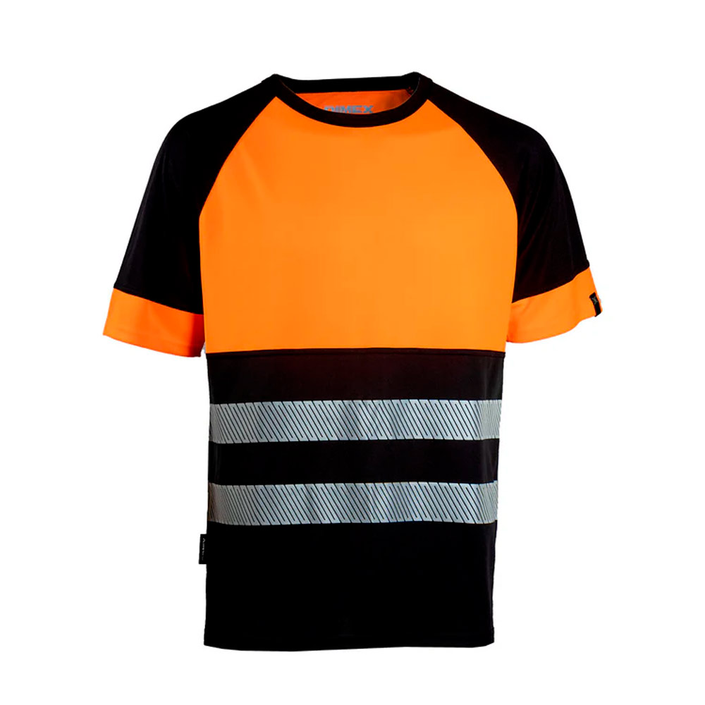 Huomiovärinen näkyvyysluokan 1 työpaita kevyestä materiaalista. Musta paidan helma on käytännöllinen työssä, jossa vaatteet likaantuvat helposti.