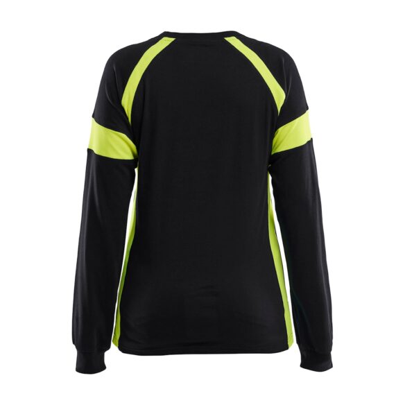 Huomiovärinen näkyvyysluokan 1 työpaita kevyestä materiaalista. Musta paidan helma on käytännöllinen työssä, jossa vaatteet likaantuvat helposti.