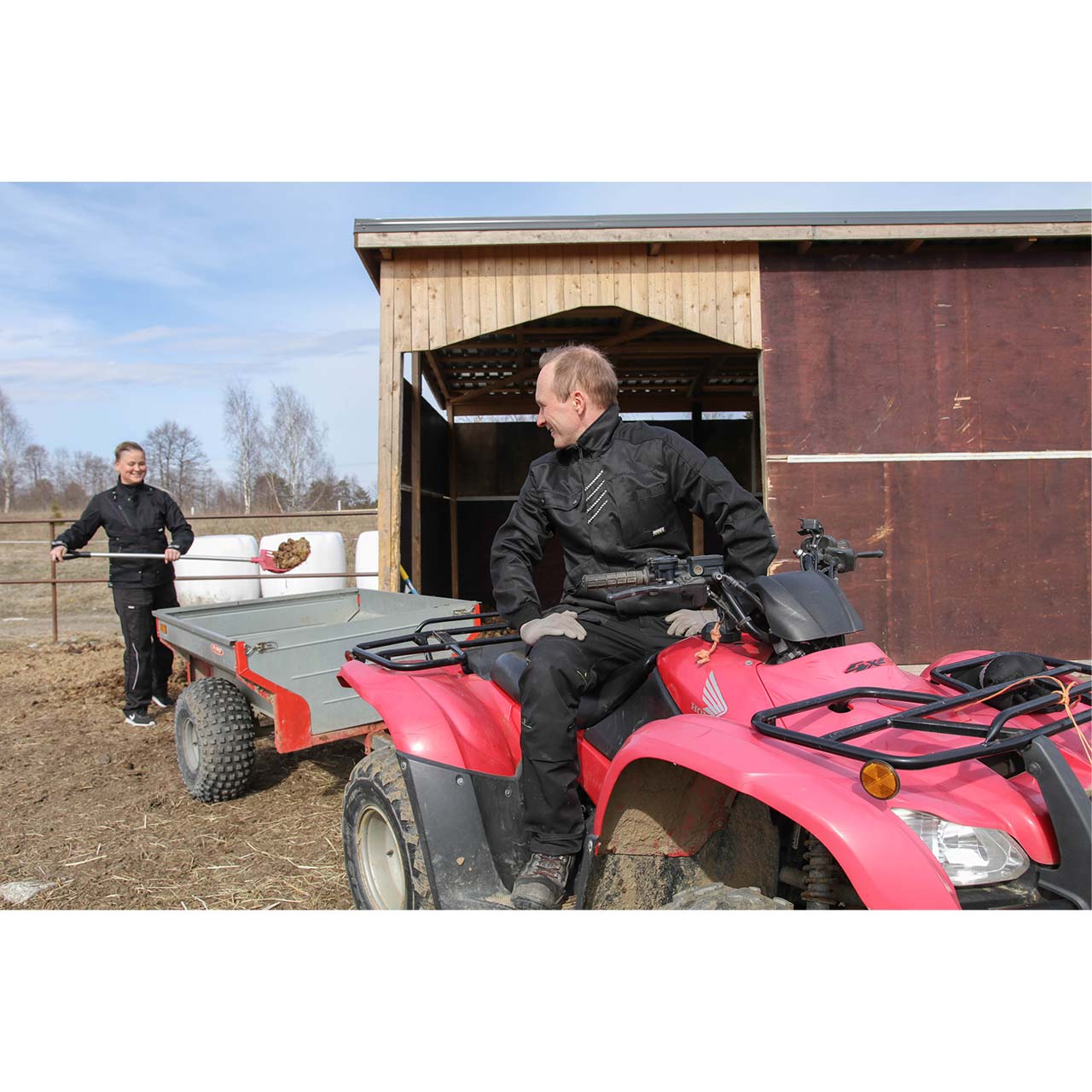 - Säänkestävää kangasta olkapäissä ja hihoissa