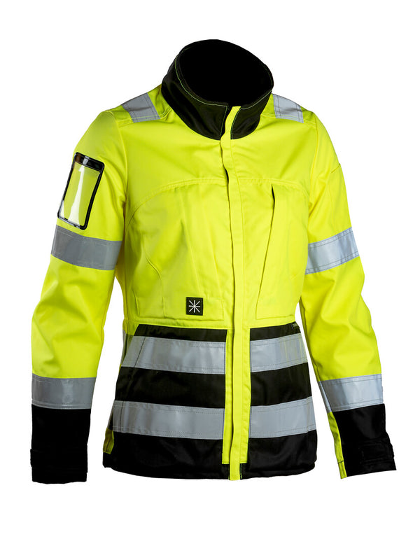 Naisten näkyvyysluokan 2 työtakki vettä ja likaa hylkivästä kierrätysmateriaalista. Helma ja vyötärö ovat joustonyörillä säädettävissä käyttäjälle sopivaksi. Istuva ja tyylikäs muotoilu.