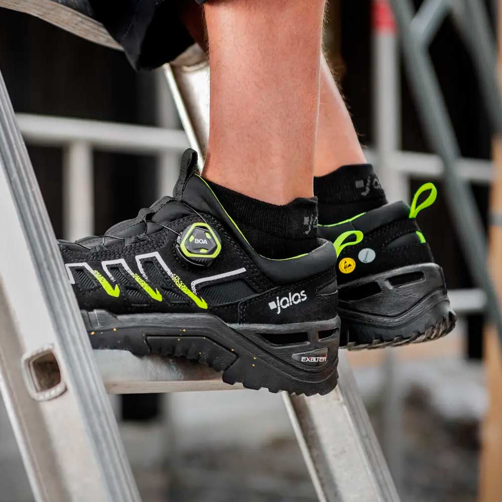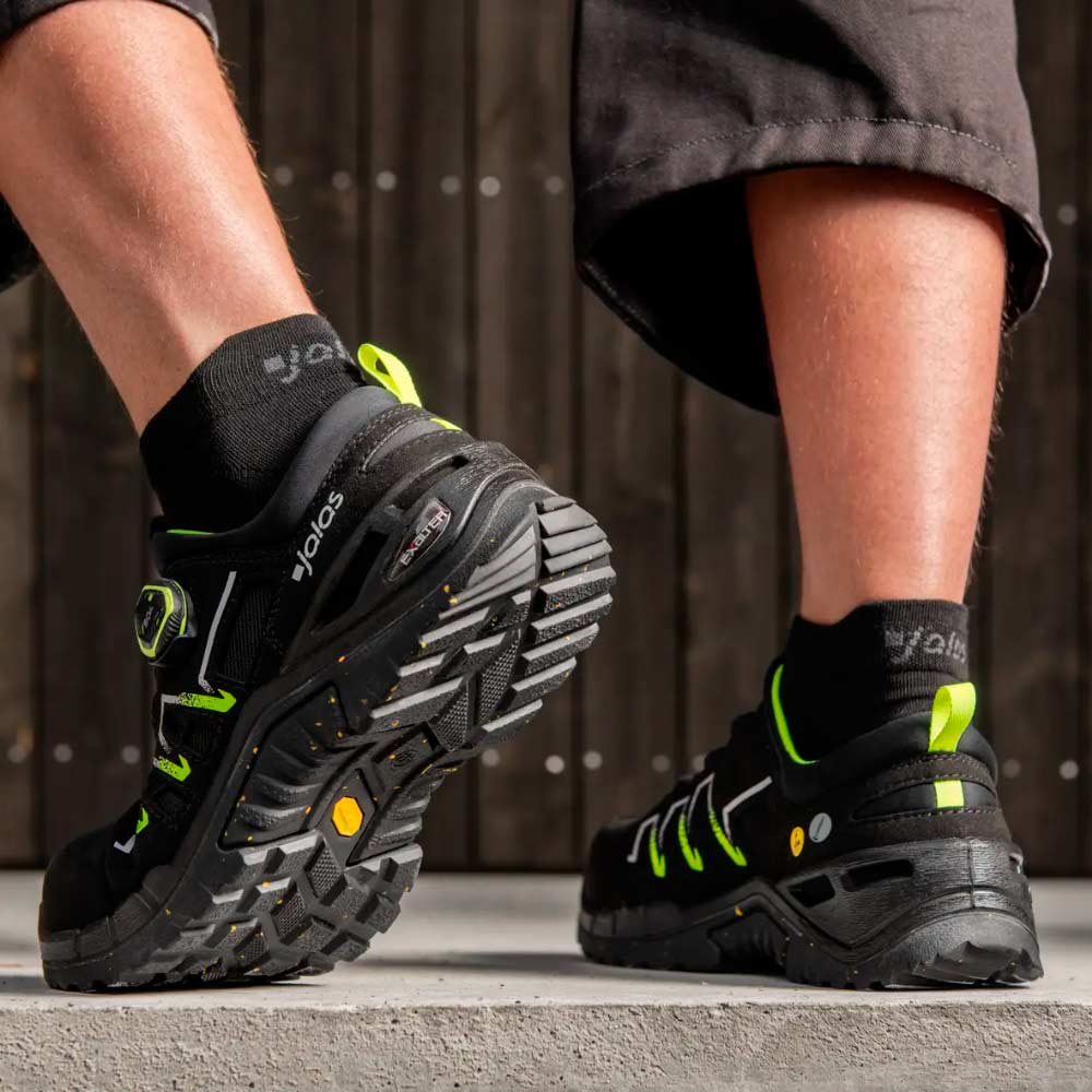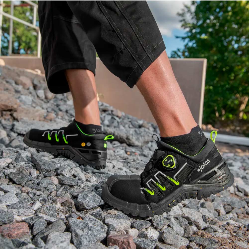 Suosittu Exalter-tuoteperhe on päivitetty vastuullisilla materiaaleilla, kestävyydestä, käyttömukavuudesta tai keveydestä tinkimättä. Turvajalkineiden päällinen on valmistettu kestävästä mikrokuidusta, josta 20 prosenttia on biopohjaista ja peräisin maissista. BOA®-kiinnitysjärjestelmä (kierrätysmateriaalista) sivulla eliminoi painepisteet ja verkkopäällysteiset tuuletusaukot tekevät jalkineesta hengittävän. Alumiininen varvassuoja, ja kierrätysmateriaalia sisältävä JALAS® EcoFlex tekstiilinaulaanastumissuoja. Pitoa parantava uusi Vibram® Ecostep-ulkopohja, joka on valmistettu 30-prosenttisesti kierrätetystä nitriilikumista.