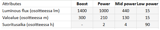 1: ANSI/PLATO FL 1 -standardin mukaiset mitatut arvot kyseisessä nimetyllä asetuksella. Jos mitään asetusta ei ole erikseen mainittu, valovirran (lumenia/lm) ja kantaman (metriä/m) arvot viittaavat kirkkaimpaan asetukseen ja paloaika (tuntia/h) arvot viittaavat alimpaan asetukseen. Tehostustoimintoa (jos se on käytettävissä) voidaan käyttää useita kertoja, mutta se on käytettävissä vain lyhyen aikaa kerrallaan. Jos valaisin on varustettu värillisillä LED(eillä), mitatut arvot ilmoitetaan valkoisella valolla tai valkoisella LEDillä. Jos valaisimessa on erilaisia energiatiloja, mittauksen perustana on ”energiansäästötila”.