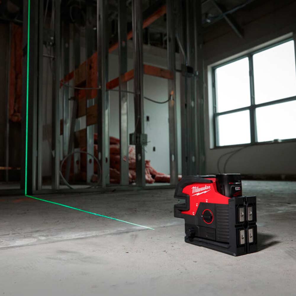 Milwaukee M12 CLL4P-0C on ammattilaisen valinta silloin, kun halutaan tehdä mittaukset ja kohdistukset nopeasti, tarkasti ja ilman säätämistä. Tässä laitteessa on kaikki samassa paketissa: kirkas vihreä ristiviiva, selkeät pystylinjat sekä neljä pistettä, joilla kohdistat esimerkiksi rakenteiden kohtisuoruuden tai siirrät pisteen lattiasta kattoon hetkessä. Vihreä laser näkyy myös kirkkaassa työympäristössä huomattavasti paremmin kuin perinteinen punainen. Laser vaaittaa itsensä automaattisesti, joten sinun ei tarvitse kuin asettaa laite paikalleen ja aloittaa työnteko. Jos haluat käyttää sitä kulmissa tai vinoilla pinnoilla, manuaalitila antaa vapaat kädet säätää kulmat juuri omiin tarpeisiin. M12-akulla laite pyörii jopa yli koko työpäivän, joten kesken jääneet linjaukset ja akun loppuminen kuuluvat menneisyyteen.