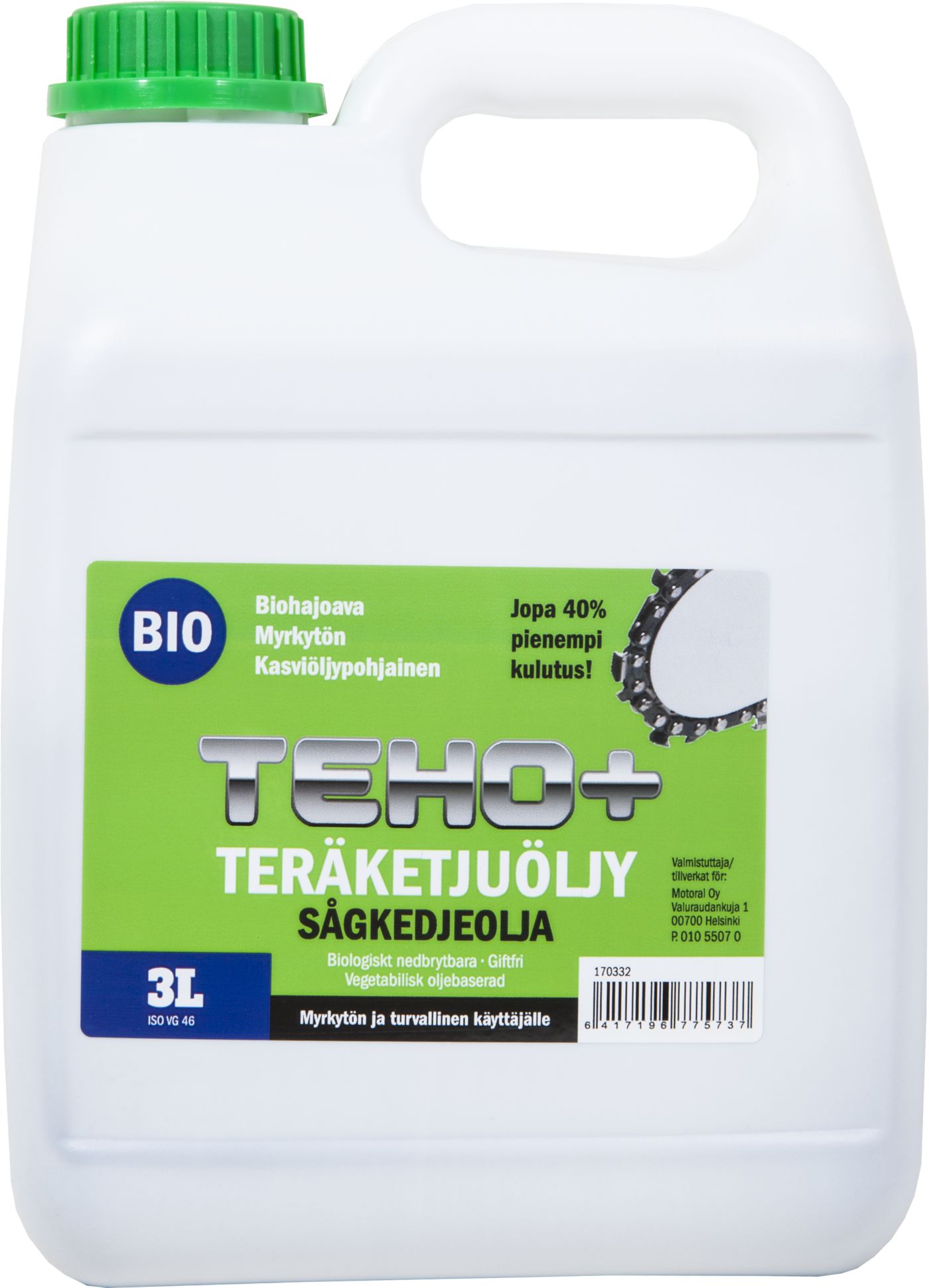 Teho+ BIO on teknisistä kasviöljyistä valmistettu teräketjuöljy. Tämän vuoksi se on turvallinen käyttäjälle ja ympäristölle. Tyypilliset arvot: ISO VG 46, viskositeetti +40 °C: 46, kaadettavuus -24 °C, leimahduspiste +300 °C. Loistavat voiteluominaisuudet kaikissa olosuhteissa. Jopa 40 % pienempi kulutus verrattuna mineraaliöljypohjaisiin teräketjuöljyihin. Tuote on helposti biohajoava.