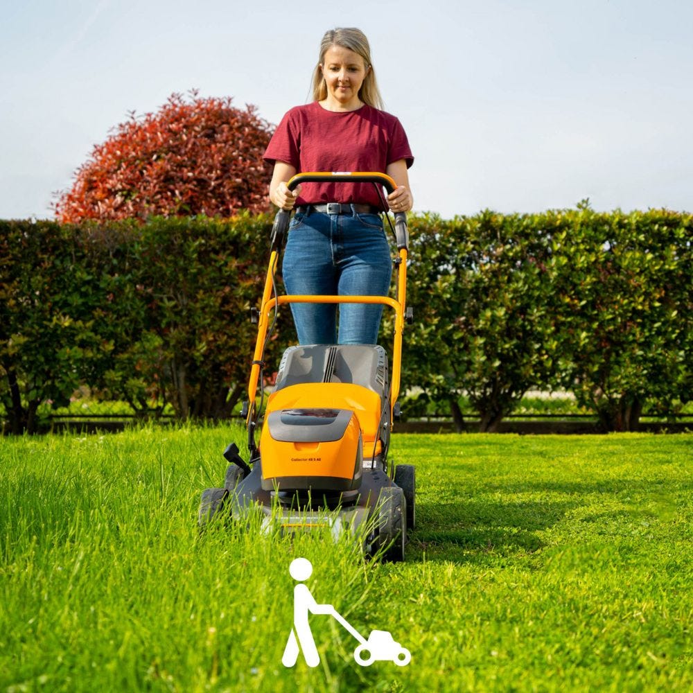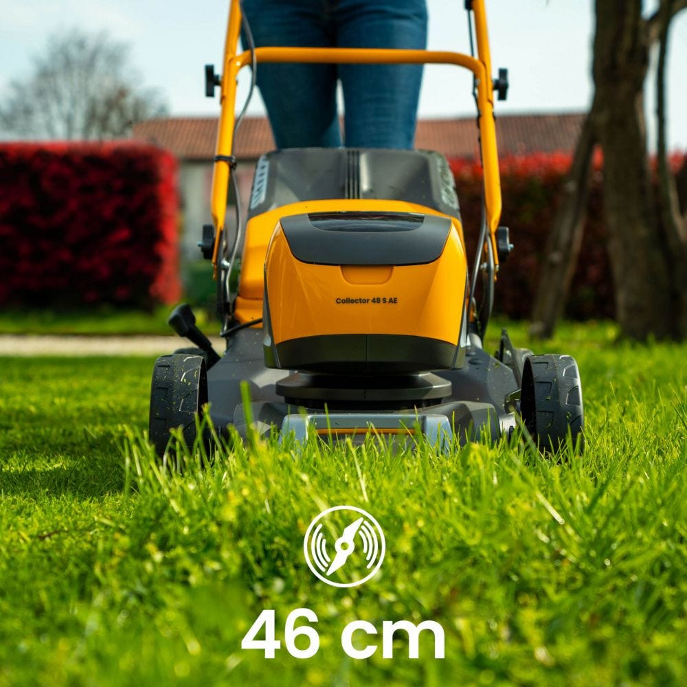 Leikkaaminen on helpompaa tasaisella nurmikolla tai kuoppaisessa maastossa uuden akkukäyttöisen Collector 48 S AE Kit -ruohonleikkurin avulla. Tämä tehokas itsevetävä ruohonleikkuri saa käyttövoimansa 1 tehokkaasta 48 V 5 Ah:n akusta ja se kattaa jopa 550 m2 yhdellä latauksella. Koska se toimii akkukäyttöisenä, se on paljon hiljaisempi kuin bensiinikäyttöinen ruohonleikkuri. Tässä akkuruohonleikkurissa on myös erittäin tehokas harjaton moottori. Parhaan tuloksen saamiseksi voit säätää leikkuutasoa helposti yhdellä vivulla kuuteen eri korkeuteen. 46 cm leikkuuleveyden ansiosta nurmikon saa leikattua nopeasti. Tilava ja tukeva 60 litran hybridiruohonkeräyspussi ja ilmaisin kertoo, kun pussi on täynnä. Kun leikkuu on valmis, taita säädettävä kahva eteenpäin ja varastoi ruohonleikkurisi!